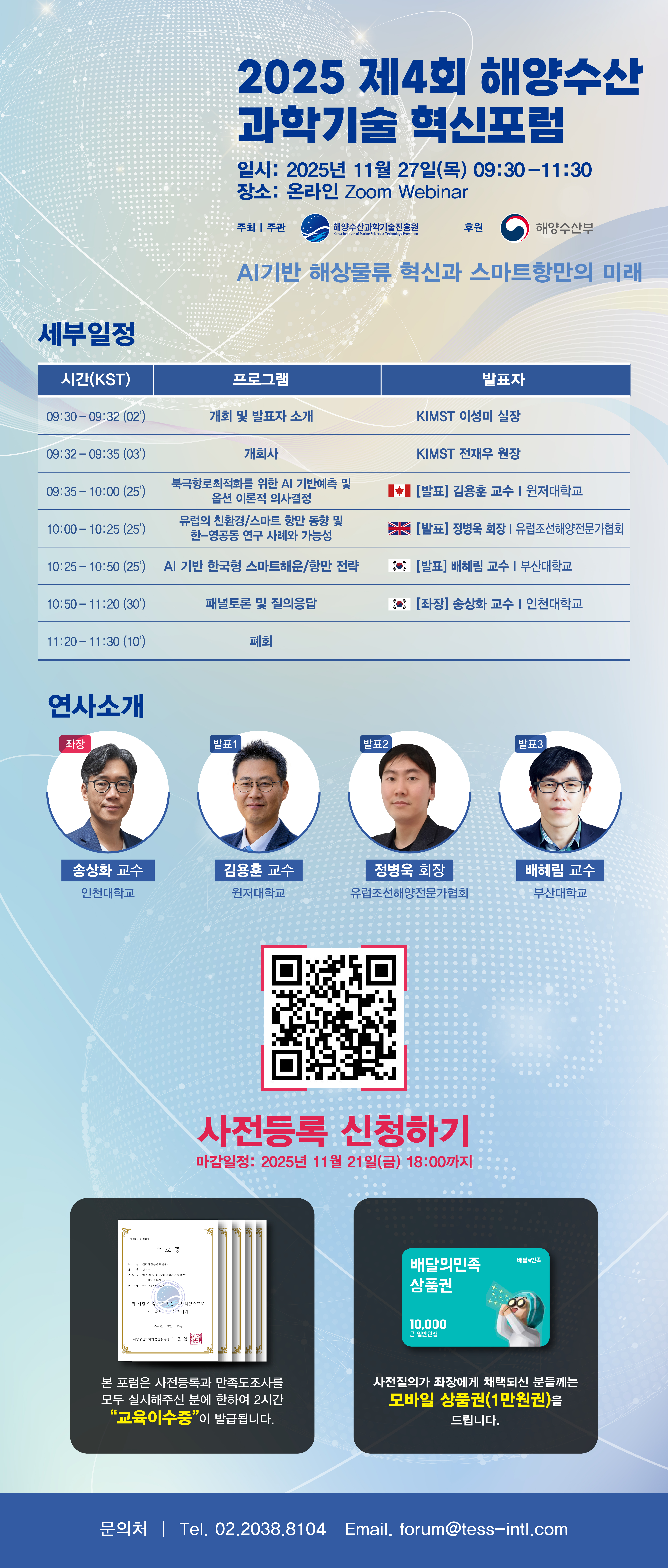 2025년도 제4회 해양수산 과학기술 혁신포럼에 대해 안내해드립니다. ◦ 주제 : AI기반 해상물류 혁신과 스마트항만의 미래 ◦ 일시 : 2025. 11. 27. (목) 09:30 ~ 11:30 ◦ 장소 : 온라인 (Zoom Webinar) ◦ 사전등록 링크 : https://www.onproject.org/conprense/link/event_registration.html?code=20251127 |